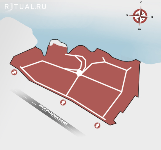 Выезд из Санкт-Петербурга по Приморскому шоссе. На КАД поворот налево. Съезд с КАД на Кронштадское шоссе направо. До некрополя 1 км прямо.