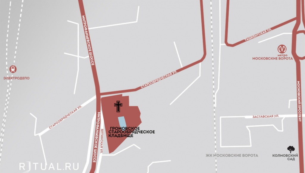 Основанный в 1835 г. некрополь в Санкт-Петербурге – Громовское Старообрядческое кладбище размещено у пересечения улиц Старообрядческой и Ялтинской. В центре — прямоугольный пруд. Сохранились старинные захоронения, есть могилы погибших при защите Отечества. Громовское Старообрядческое кладбище в Санкт-Петербурге — общественный некрополь с традиционным способом погребения.