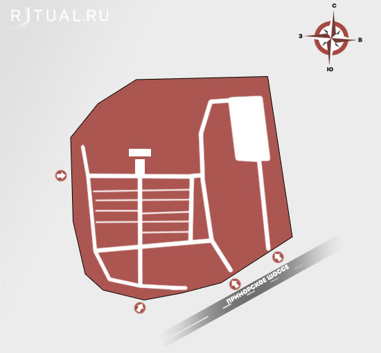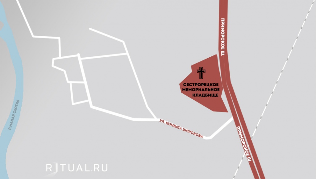 Адрес Сестрорецкого мемориального кладбища: 37-й км Приморского ш., участок 1, восточнее дома №1.