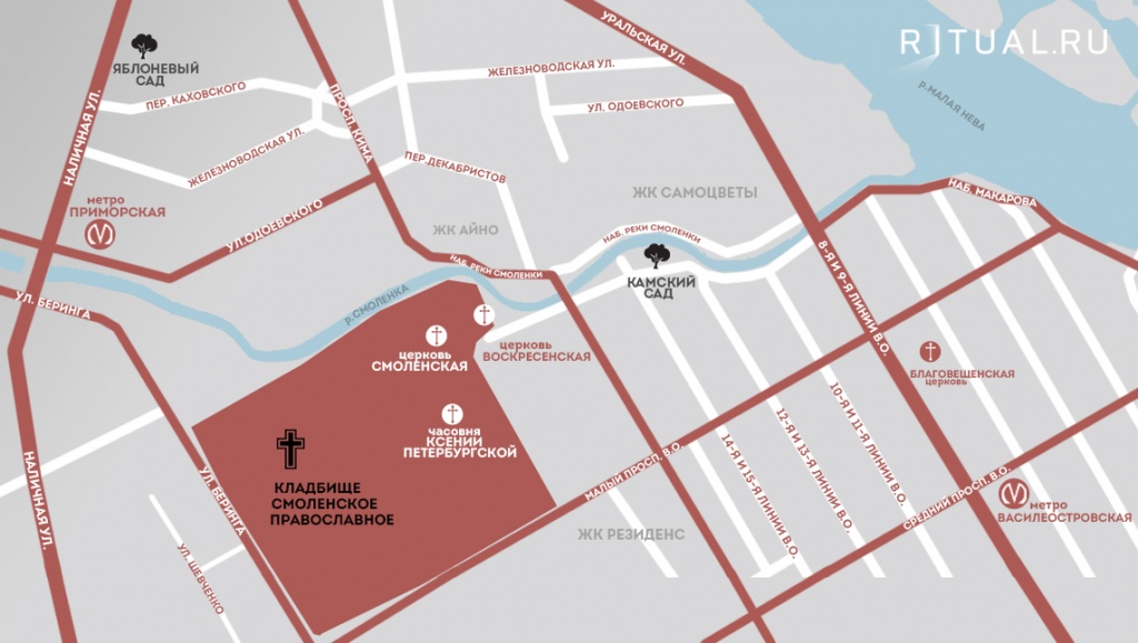 Адрес Смоленского православного кладбища: г. Санкт-Петербург, Камская улица, д. 26