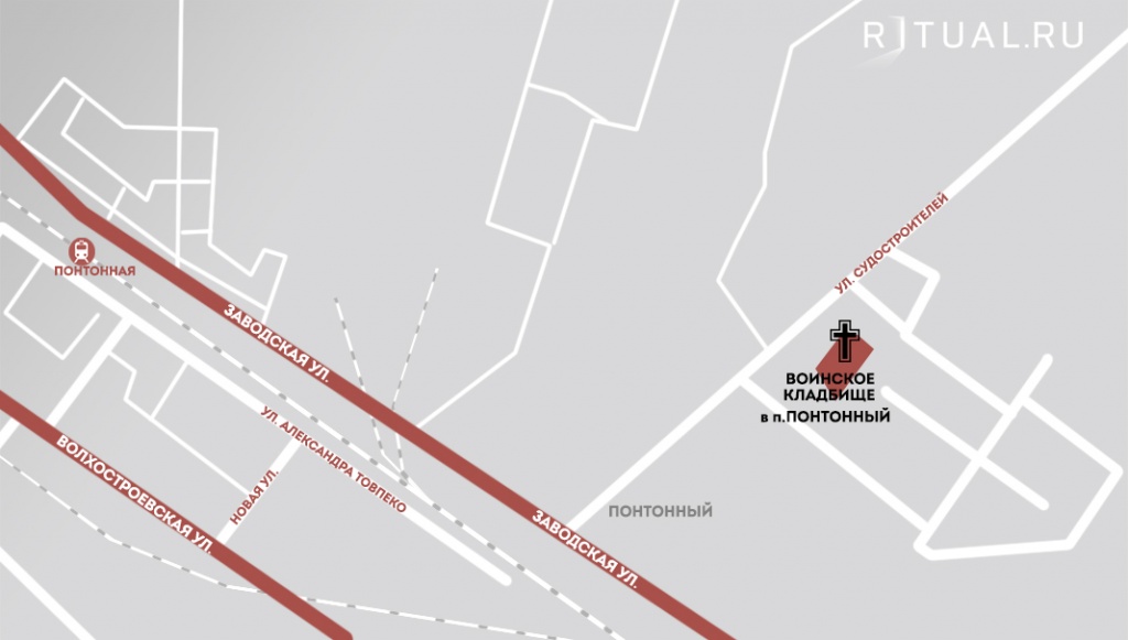 Адрес воинского кладбища в посёлке Понтонный: ул. Судостроителей.