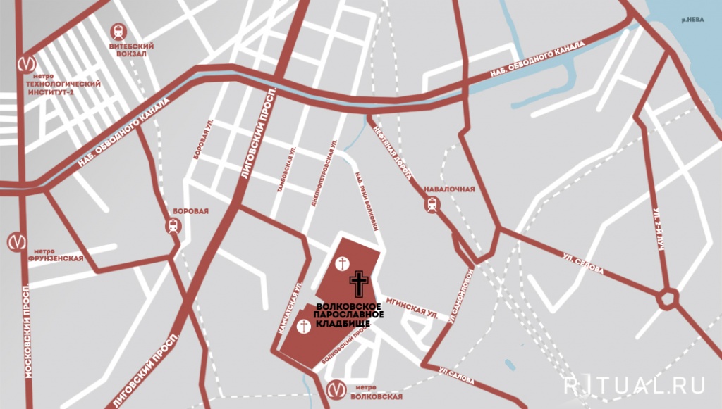 От ст. «Волковская» пройти по наб. реки Волковки 450 метров: сначала на Волковский проспект, затем налево, через мост, ко входу в некрополь.