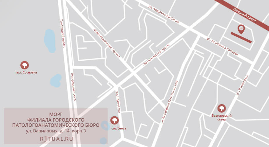 От ст. метро «Академическая» на маршрутке К176 проехать 4 остановки до «Улицы Академика Байкова, 21» и пройти к корпусу морга 150 метров.
