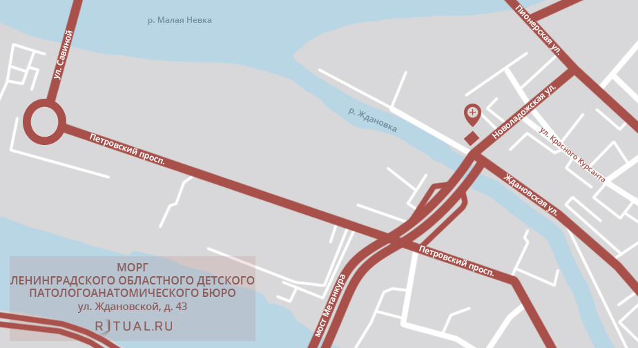 От ст. метро «Чкаловская» на автобусе № 191 проехать до «Новоладожской улицы» (3 ост.) и пройти к корпусу морга 100 метров по ул. Ждановской.