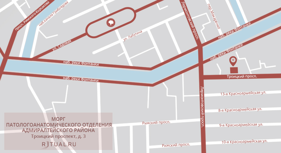 С Невского проспекта — ул. Садовую, через 2 км поворот влево, на Вознесенский проспект, Измайловский мост, Измайловский просп. Через 300 м поворот вправо, на Троицкий просп., через 470 м съезд вправ0, к моргу.