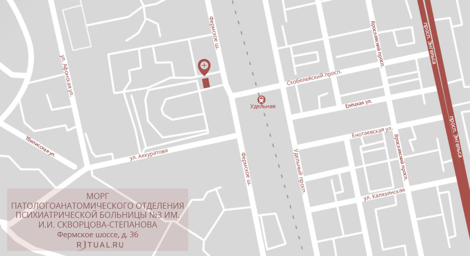 От ст. метро «Удельная» на автобусах №№ 38, 40, 44 или маршрутном такси К40 проехать 3 остановки до «Вербной улицы» и пройти по улицам Афонской и Поклонногорской 250 метров к корпусу морга.