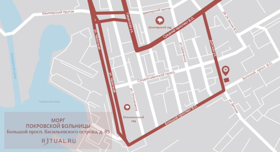 С Невского проспекта — по Дворцовому проезду, Дворцовому мосту на наб. Макарова, затем влево, на Средний просп. Васильевского Острова. Через 2,7 км — влево, на ул. Детскую, к моргу.