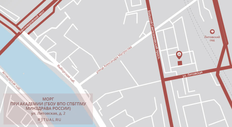 С Невского проспекта — на Литейный просп., Литейный мост, ул. Академика Лебедева, Лесной просп. Через 2 км выезд в левую сторону, на ул. Литовскую, к моргу.