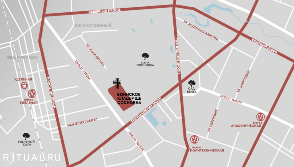 Как доехать до воинского кладбища Сосновка? Проезд к воинскому кладбищу Сосновка на машине и на метро описан ниже.